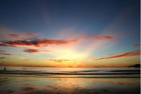 Khi những đốm đen của đêm tối qua đi, bình minh lại tới, Cửa Lò (Nghệ An) hiện ra huyền ảo trong những tia nắng đầu ngày. Vẻ đẹp của biển cả và mây trời như hòa quyện vào nhau để làm tăng thêm cái thanh khiết của ngày mới! Hình ảnh do bạn Quảng Hùng Mạnh chia sẻ.